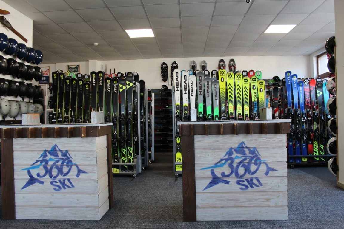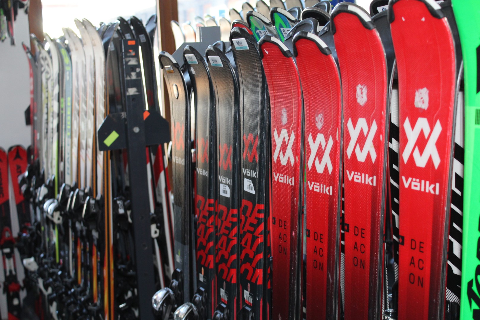 The shop holds over 350 pairs of skis, snowboards, and boots in multiple categories.
